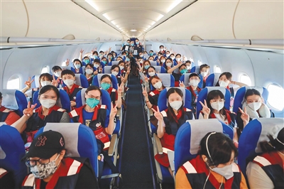 | 59名援琼医疗队队员抵达海口后在飞机上留影,他们抵琼后迅速投入大规模核酸筛查工作。 本报记者 邱肖帅 摄 |