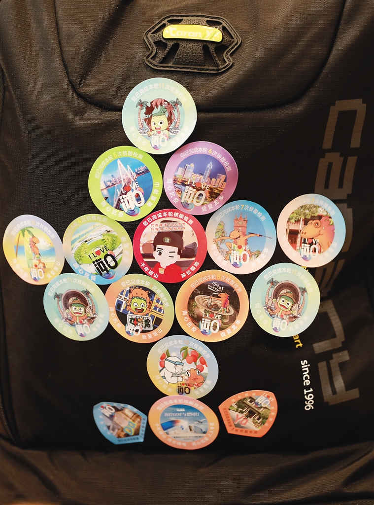 | 一名援琼医疗队队员的背包上贴满了海口核酸检测的贴纸。本报记者 李天平 摄 |