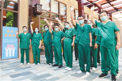 | 在三亚市第二酒店方舱医院,援琼医疗队医护人员举行关舱仪式。 本报记者 武威 摄 |