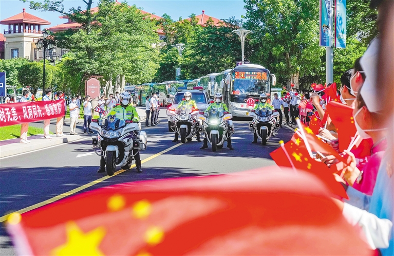 | 在儋州市海花岛,首批驰援儋州的400余名医疗队员离琼返程,当地群众热烈欢送。在20多天的时间里,该医疗队建成3个气膜核酸检测实验室,完成180多万管样本检测。本报记者 陈元才 摄 |
