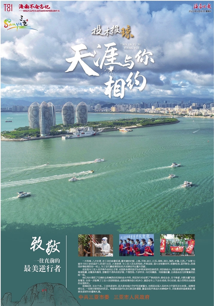 艰难困苦,玉汝于成。三亚这座城市,因大家的倾力守护而涅槃重生,也将因全国人民的关心守望而茁壮发展。疫情终将过去,一切美好都将如约而至。希望援琼医疗队员们常回来看看,重温这段并肩战斗的峥嵘岁月,共享鹿城的温暖美丽,接受这座城市的最高礼遇。