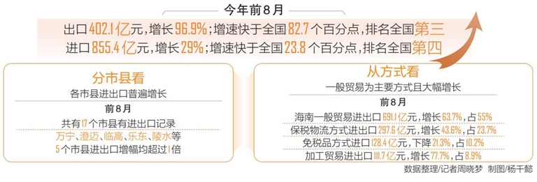 本报讯(记者周晓梦)近日,海口海关披露,今年前8个月海南外贸增速大幅领先全国。前8月海南货物贸易进出口1257.5亿元,同比(下同)增长45%,快于同期全国增速34.9个百分点,增速全国排名第五。