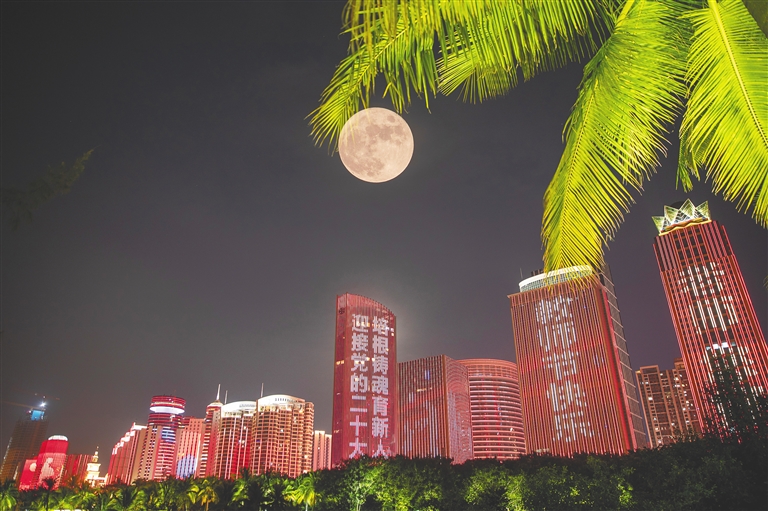 9月10日,中秋佳节,海口天气晴好,明月当空。当天恰逢教师节,滨海大道楼宇打造中秋节和教师节主题的灯光秀,绚丽夺目。(二次曝光拍摄) 本报记者 李天平 摄