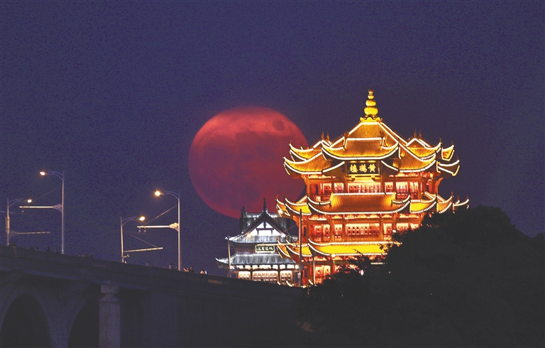 图为一轮圆月从湖北武汉黄鹤楼后升起。新华社发