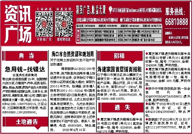 吴方彬、吴方毅现向我局申请土地证遗失补发业务,该宗地位于海口市琼山区府城红星大路村,面积为200.01平方米。经调查,该申请人持有的2001-01-02241号《国有土地使用权证》已登报遗失,现我局通告注销该证,上述土地证将不再具有法律效力。凡对此有异议者,请自通告发布之日起十五日内向我局琼山分局提出书面申述,逾期无异议,我局将依法补发上述宗地新的《不动产权证》。联系人:陈善鸿,电话:65809395。特此通告。 2022年4月19日