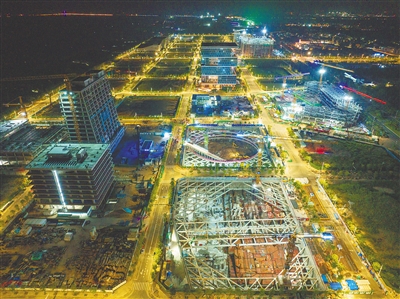 近日,入夜后的海口江东新区总部经济区,多个重点项目施工现场仍灯火通明,工人轮班施工,铆足干劲推进项目建设。