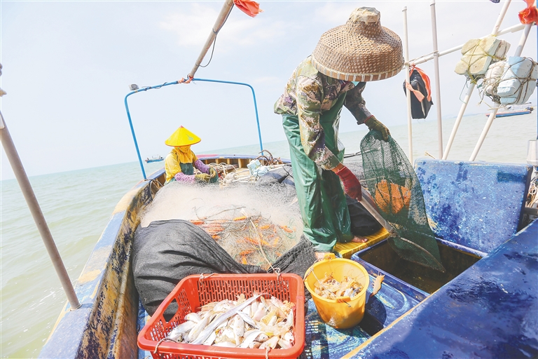 9月12日下午,在乐东佛罗镇近海,渔民在船上将收获的鱼虾装筐。
