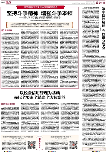 《习近平谈治国理政》第四卷中关于坚持斗争精神、增强斗争本领的重要论述,明确了新时代共产党人斗争的多维内容要求,我们要深学细悟、自觉践行,不断增强斗争意志和斗争本领,在敢于斗争、善于斗争中战胜前进道路上一切可以预见和难以预见的风险挑战,推动海南自由贸易港建设行稳致远,朝着实现中华民族伟大复兴的宏伟目标阔步前行。