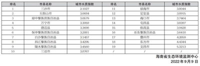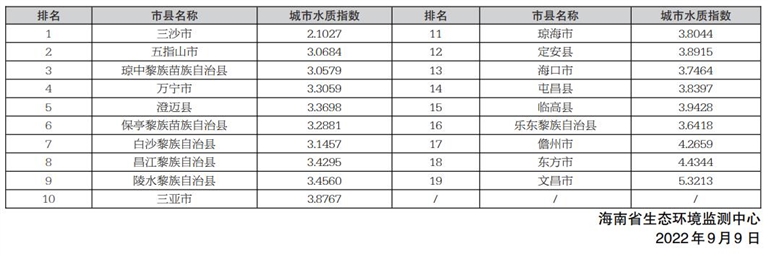 19个市县水环境质量按由好至差排名分别为:三沙市、五指山市、琼中黎族苗族自治县、万宁市、澄迈县、保亭黎族苗族自治县、白沙黎族自治县、昌江黎族自治县、陵水黎族自治县、三亚市、琼海市、定安县、海口市、屯昌县、临高县、乐东黎族自治县、儋州市、东方市、文昌市。详见右表:
