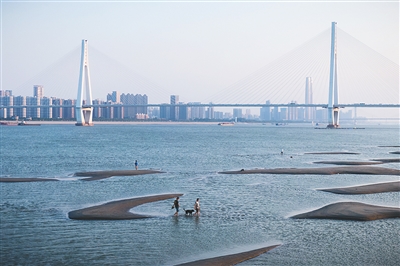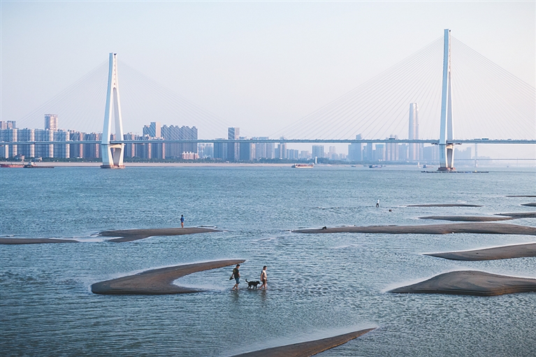 图为9月13日,市民在汉口江岸滩涂上游玩。