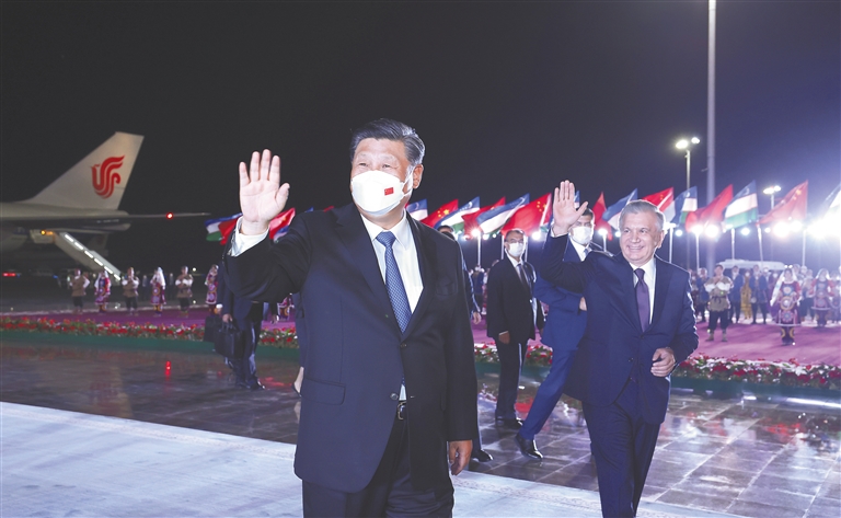 新华社乌兹别克斯坦撒马尔罕9月14日电 (记者刘华 蔡国栋)当地时间9月14日晚,国家主席习近平乘专机抵达撒马尔罕,开始对乌兹别克斯坦共和国进行国事访问并出席上海合作组织成员国元首理事会第二十二次会议。