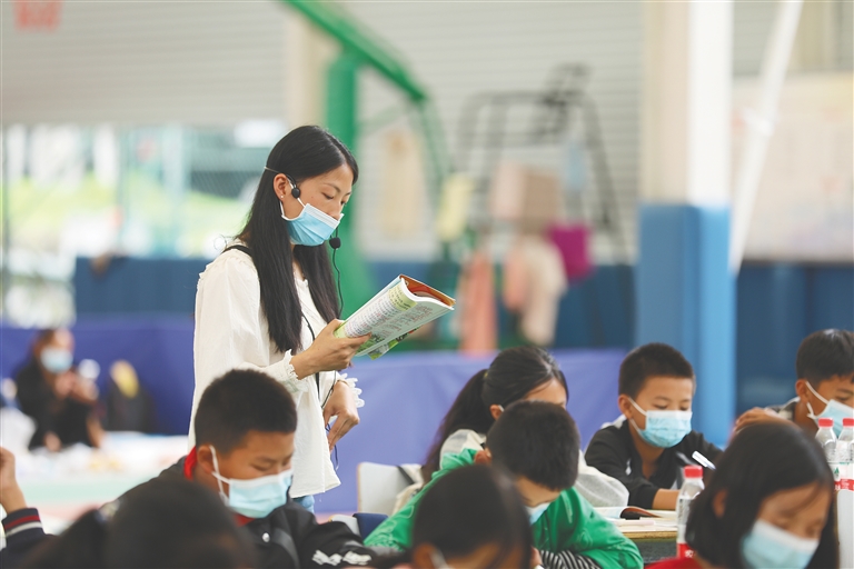 图为在石棉县王岗坪乡,老师在国家能源集团大渡河大岗山公司提供的场地为学生们讲课。新华社发