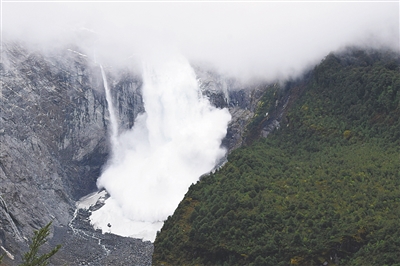 视频显示,这座冰川位于一处约200米高的山顶,断裂后坠下山崖,轰隆作响、激起巨大水雾。