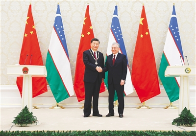 习近平致答辞。习近平指出,米尔济约耶夫总统向我授予“最高友谊”勋章,充分体现出乌方对中乌关系的高度重视,以及乌兹别克斯坦人民对中国人民的深情厚谊。乌兹别克斯坦著名诗人纳沃伊说:“没有比生活在友谊之中更美好的事情。”早在两千多年前,中乌两个伟大民族就以丝绸之路为纽带,互通有无、互学互鉴。30年前,中乌建交,开启了两国人民友好新篇章。两国全面战略伙伴关系实现跨越式发展,各领域合作取得丰硕成果,有力促进了各自发展振兴,也为维护中亚地区乃至世界和平稳定注入了正能量。我和米尔济约耶夫总统商定,深化新时代中乌全面战略伙伴关系,致力于践行中乌命运共同体。中方愿同乌方一道努力,谱写中乌友好新篇章。