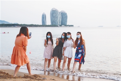 9月15日傍晚,市民在三亚湾游玩打卡。 见习记者 王程龙 摄