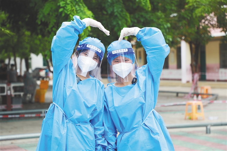临近中午,虽说附近有树荫及建筑物遮挡,但依然闷热。套着一身严实的防护服,让两姐妹的鼻尖一直冒着汗珠,后背的汗水也早就浸湿了隔离衣。“不能张嘴喝水,那就多走路带带风,让身体凉爽一会儿!”她俩不时快步奔走在队伍间,打趣地道出这一解暑“小秘诀”。