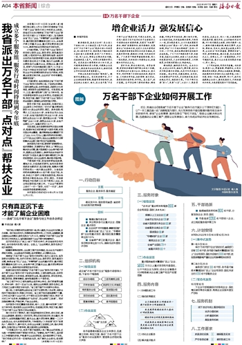 《方案》明确,“万名干部下企业”服务行动目标以服务企业、服务项目、服务基层为主题,以落实党中央、国务院和省委、省政府出台的系列政策举措为主线,紧紧抓住稳增长稳市场主体这个关键,强化行业统筹,突出帮扶各行业重点企业、困难企业、重点项目,按照“9月加快推进复工复产,10月至12月全力冲刺全年目标任务”的部署,指导帮助企业守住疫情防控和安全生产底线,实现惠企政策应享尽享,企业诉求“件件有着落、事事有回音”。