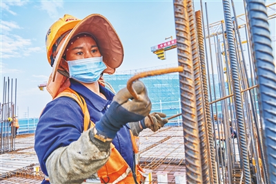 ③9月15日,海医一附院江东院区项目,工人在绑扎钢筋。 本报记者 封烁 摄