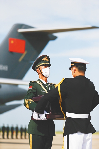北京时间上午8时35分,中韩双方在韩国仁川国际机场举行志愿军烈士遗骸交接仪式。空军运-20专机于9时30分从韩国仁川机场起飞,进入中国领空后,两架歼-20为其护航,向英雄致敬。沈阳桃仙国际机场以“过水门”最高礼遇迎接志愿军烈士回家。