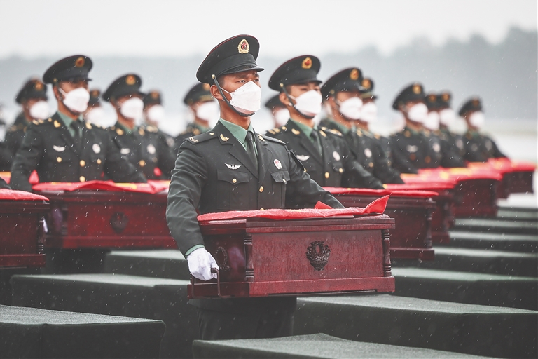仪式现场庄严肃穆,《思念曲》奏响,礼兵护送着覆盖中华人民共和国国旗的志愿军烈士遗骸的棺椁,缓步来到棺椁摆放区。全体肃立,奏唱国歌,现场全体人员向烈士遗骸三鞠躬。