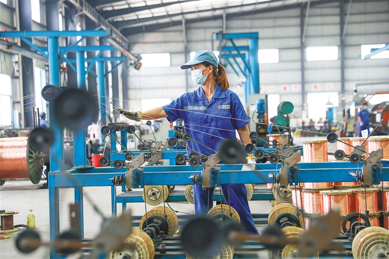 近日,位于海口国家高新区狮子岭工业园区的海南美亚电缆集团有限公司生产厂房内,工人在调整高绞机上的铜线。目前,海南美亚电缆集团有限公司200多名员工已全部到岗,在落实各项防疫措施的前提下全力恢复生产。本报记者 李天平 摄