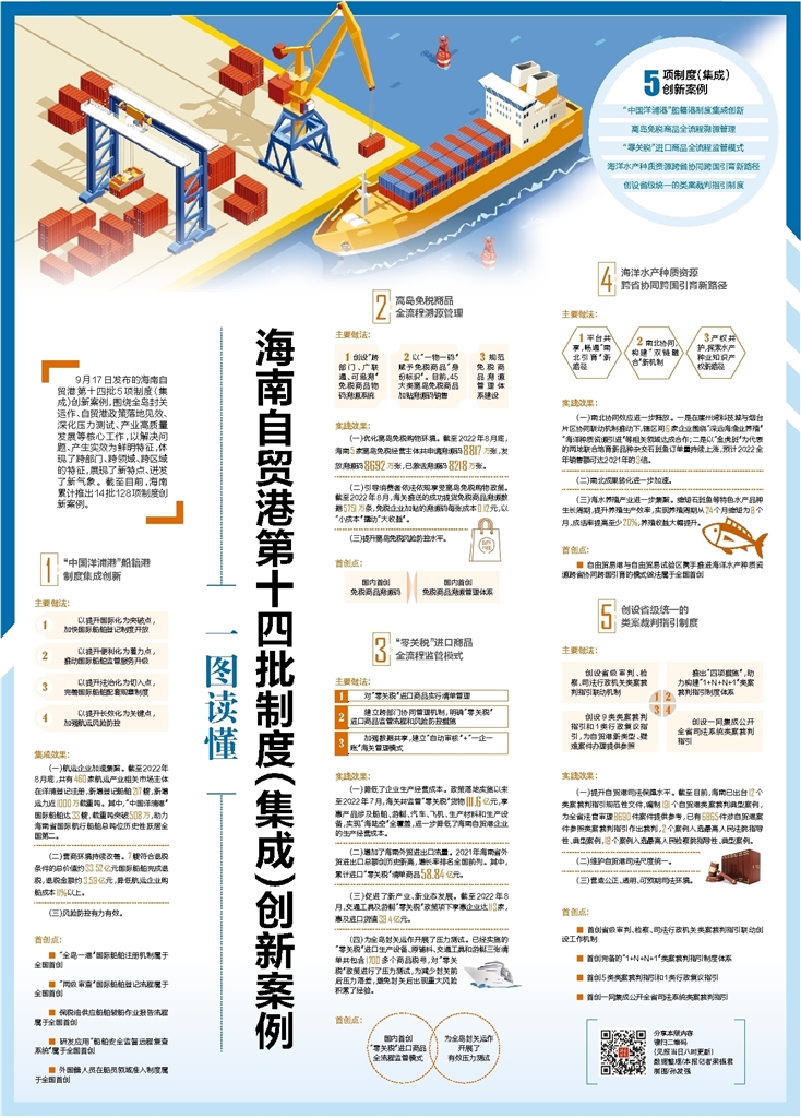9月17日发布的海南自贸港第十四批5项制度(集成)创新案例,围绕全岛封关运作、自贸港政策落地见效、深化压力测试、产业高质量发展等核心工作,以解决问题、产生实效为鲜明特征,体现了跨部门、跨领域、跨区域的特征,展现了新特点、迸发了新气象。截至目前,海南累计推出14批128项制度创新案例。