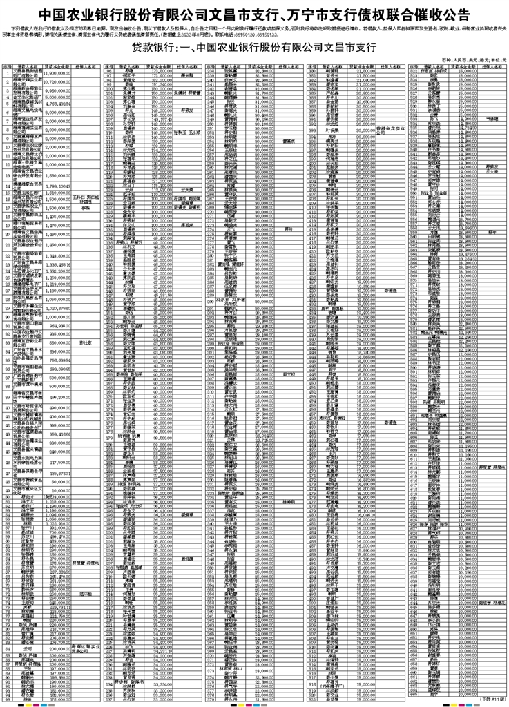 下列借款人在我行的借款以及相应的利息已逾期。现发出催收公告,限以下借款人及担保人,自公告之日起一个月内到我行履行还款或担保义务,否则我行将依法采取措施进行清收。若借款人、担保人因各种原因发生更名、改制、歇业、吊销营业执照或者丧失民事主体资格等情形,请相关承债主体、清算主体代为履行义务或者承担清算责任。(数据截止2022年8月底)。联系电话:66150120,66150122。