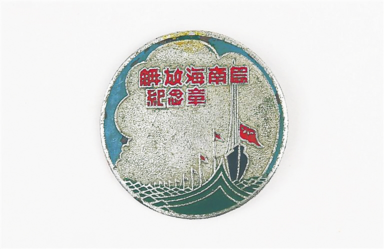 蓝天白云掩映,海面波涛汹涌,一艘艘悬挂着“八一”军旗的木帆船劈波斩浪迎面驶来……这枚漂亮的铜制徽章就是解放海南岛纪念章。直径3厘米的章面上,生动展示了解放军战士向海南岛进军的壮阔场面。