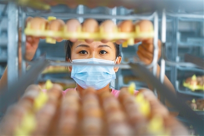 近日,在文昌市东路镇的海南传味文昌鸡种鸡场,工人在搬运鸡蛋。受疫情影响,该企业今年整体销售虽有小幅波动,但在文昌有关部门的协调帮助下积极抓生产、找销路,生产不断档,目前文昌鸡存栏量有400万只,日销量约4万只。