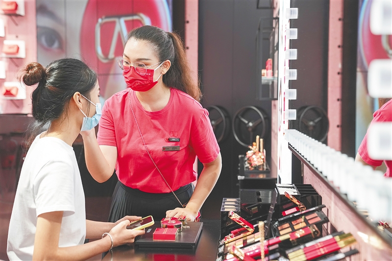 在一楼香化区,顾客在导购员介绍下试用护肤品和香水。收银台处,收银员杜聪慧在忙碌着。她手里拿着胶带和剪刀,仔细包装好顾客购买的商品,“现在的客流量虽然没有疫情前多,但也不能懈怠。我们要认真服务好每位客户,让他们满意而归。”