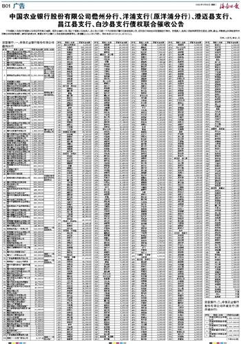 中国农业银行股份有限公司儋州分行、洋浦支行(原洋浦分行)、澄迈县支行、昌江县支行、白沙县支行债权联合催收公告
