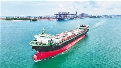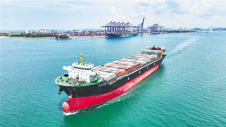 9月19日,在洋浦经济开发区国际集装箱码头,港口作业繁忙,大型船舶进出频繁。