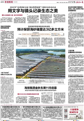 本报讯(记者李梦瑶 特约记者黎大辉)海南海砂资源调查再添新成果!2022年海南岛海砂资源调查评价项目——乐东-东方外海域海砂调查完成野外作业,预估探获海砂储量达3亿多立方米,这是海南日报记者日前从省地质局获悉的。