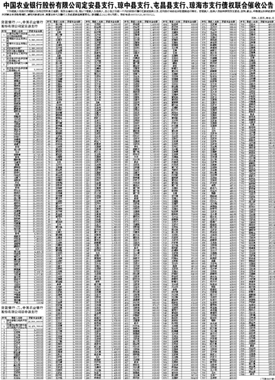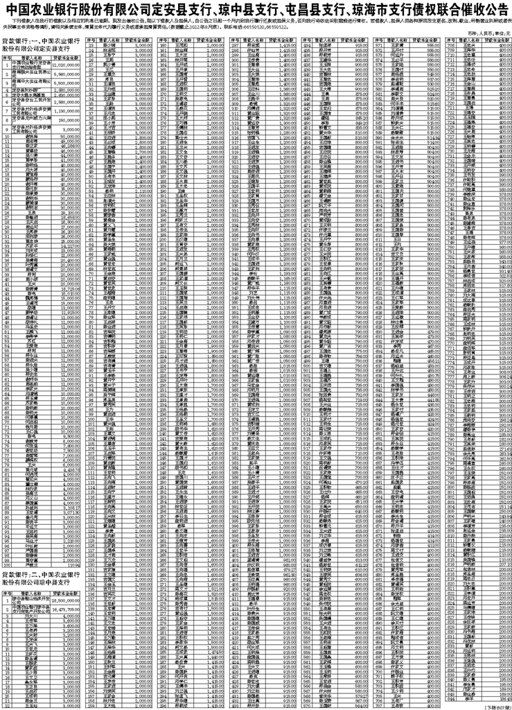中国农业银行股份有限公司定安县支行、琼中县支行、屯昌县支行、琼海市支行债权联合催收公告