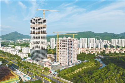 9月19日,俯瞰三亚中交国际自贸中心总部项目工地。据悉,在做好防疫措施及保证质量、安全的前提下,项目部将采取增加工人数量、加大材料供应等措施进行抢工,力争最终按原计划完成竣工交付。