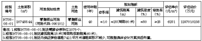 一、挂牌出让宗地基本情况和开发建设要求:(一)挂牌出让宗地基本情况:本次挂牌出让宗地位于三亚海棠湾国家海岸休闲园区控规HT05-08-01地块,面积207488.44平方米,用地四至及界址坐标详见地块勘测定界图。该宗地规划用地性质为零售商业用地(用地代码:090101),对应土地用途为零售商业用地。2022年7月29日,三亚市人民政府出具了《关于海棠湾片区控规HT05-08-01地块内约20.76公顷用地具备净地出让条件的证明》,证明控规HT05-08-01地块内约20.76公顷用地土地征收及“两公告一登记”工作已完成。三亚市海棠区人民政府已与被征地(收地)单位签订了《征收土地补偿协议书》(《收回国有土地补偿协议书》),土地补偿款、安置补助费、青苗及地上附着物补偿费用等款项已支付到位,相关征地材料现存于三亚市海棠区人民政府。目前地块上的附着物已清表,无法律经济纠纷、土地开发利用规划条件明确,符合土壤环境质量要求。地块周边可以满足施工建设所需的水、电供应,相关设备、机械可以进场施工。该宗地具备净地出让的条件。经我局核查,该宗地不属于非法占地、违法建设行为已经处置到位并组织供应的土地。该宗地概况及规划指标等情况详见下表: