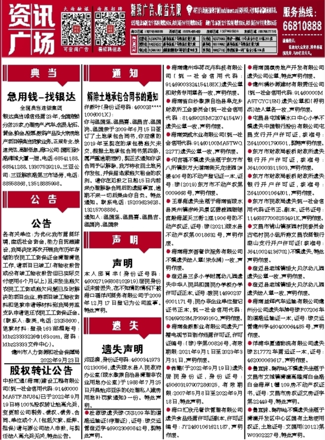 ●何吉福不慎遗失坐落于东方市八所镇东方大道南侧天龙佳园2#楼406号的不动产登记证一本,证号:琼〔2019〕东方市不动产权第0009668号,声明作废。