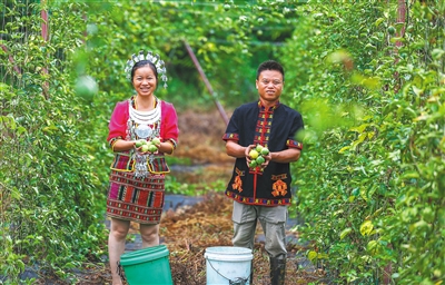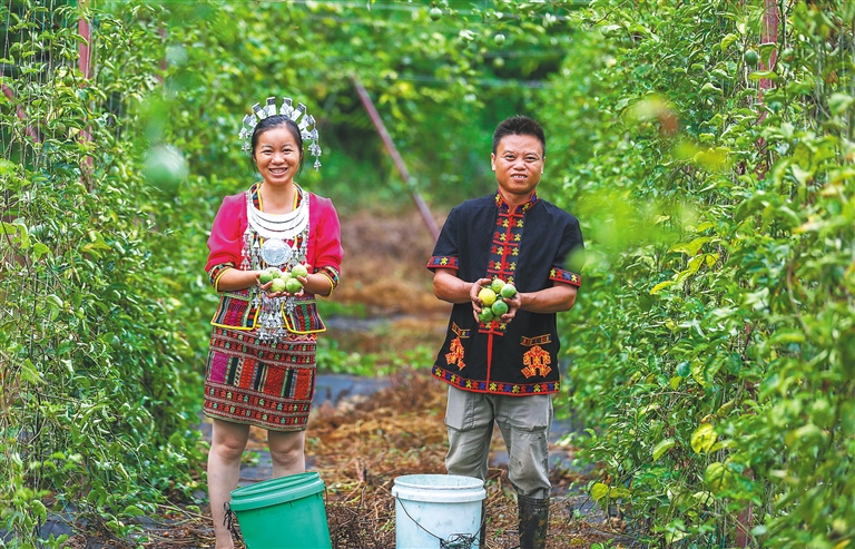 9月22日,在五指山毛道乡毛卓村的百香果基地里,村民展示成熟的百香果。据了解,目前毛道乡种植百香果面积180亩,年亩产约2000斤,亩产值约1.6万元。每年百香果丰收季节,百香果基地都会吸纳周边村民前来务工采摘,增加村民收入。本报记者 李天平 摄