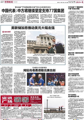 新华社联合国9月23日电 第46届“77国集团和中国”外长会23日在纽约联合国总部举行。集团主席国巴基斯坦外长比拉瓦尔主持会议,第77届联大主席克勒希、联合国秘书长古特雷斯、古巴外长罗德里格斯等在开幕式上致辞。中国常驻联合国代表张军出席会议,并代表国务委员兼外长王毅发言。