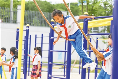 9月23日,迁入白沙黎族自治县第一小学的学生们在锻炼设施上玩得不亦乐乎。