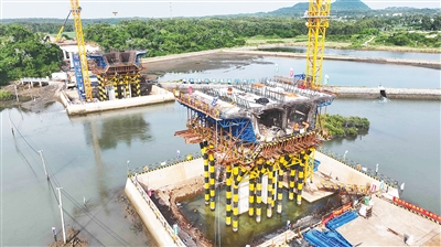 鱼骨港大桥是海南环岛旅游公路儋州段项目的重要控制性工程。儋州启动固定资产投资百日冲刺行动后,项目承建单位中咨集团项目部在做好常态化防疫的前提下,多管齐下加快推进实现复工达产,施工迅速实现“满血复活”,掀起百日攻坚的热潮。