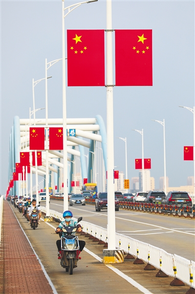 随着国庆临近,9月26日,海口琼州大桥挂上了整齐划一的五星红旗,喜庆祥和的节日氛围日渐浓郁。本报记者 李天平 摄