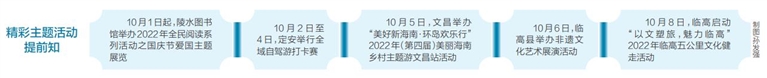 10月5日,省旅文厅将在文昌举办“美好新海南·环岛欢乐行”2022年(第四届)美丽海南乡村主题游文昌站活动,以乡村旅游消费和乡村旅游推介为侧重点,组织乡土、乡创、美食、非遗等市集,融合民族文化活动、乡村沉浸式体验和打卡乡村旅游精品线路等新形式,促进乡村旅游发展。