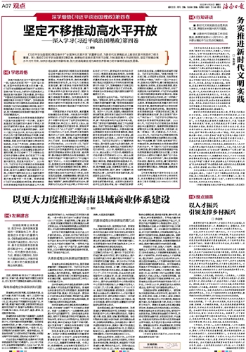 加强县域商业体系建设,是党中央、国务院高度重视的一项基础性工作,是全面推进乡村振兴的重要内容。《海南省县域商业体系建设实施方案》提出,到2025年,基本实现县域有连锁商超和配送中心、乡镇有商贸中心、村村通快递的目标。为此,要强化问题导向,加快补齐基础设施和公共服务短板,以更大的力度推进县域商业体系建设。