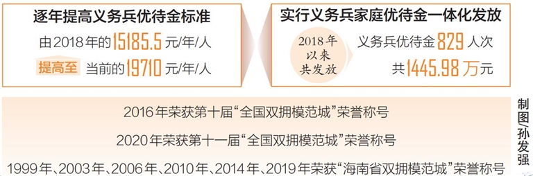 开展“双拥杯”男子篮球邀请赛、对烈士纪念设施进行整修、走访慰问文昌籍现役军人家庭……文昌市将双拥工作经费列入年度预算,全力支持双拥工作。2018年以来,该市安排各类双拥经费约4.05亿元,有力地保障了双拥工作正常、有序、有效开展。