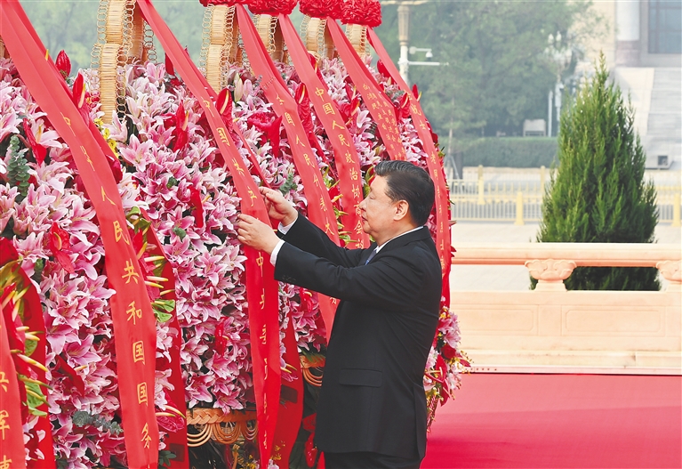 习近平迈步上前,仔细整理花篮缎带。随后,习近平等党和国家领导人缓步绕行,瞻仰人民英雄纪念碑。