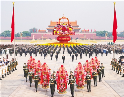 10时整,向人民英雄敬献花篮仪式开始。军乐团奏响《义勇军进行曲》,全场齐声高唱中华人民共和国国歌。