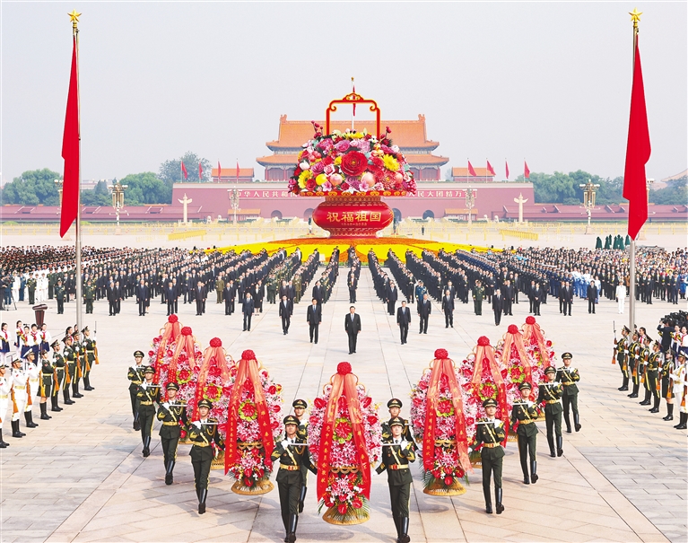 壮阔的天安门广场上,鲜艳的五星红旗高高飘扬,人民英雄纪念碑巍然耸立。广场中央,“祝福祖国”巨型花篮表达着对国家繁荣富强的美好祝愿,花篮上“喜迎二十大”的字样传递着全党全军全国各族人民对党的二十大胜利召开的热切期盼。