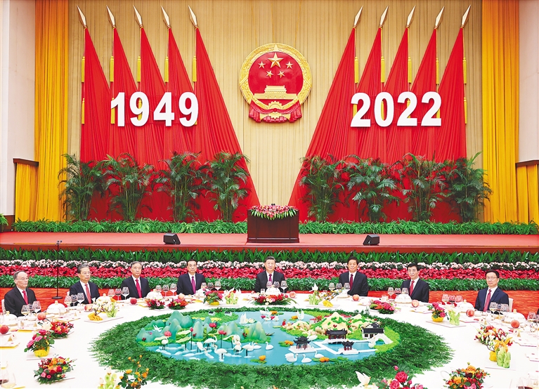 人民大会堂宴会厅华灯璀璨、鲜花绽放,洋溢着喜庆热烈的节日气氛。主席台上方,庄严的国徽高悬,“1949-2022”的大字年号在鲜艳的红旗映衬下格外醒目。