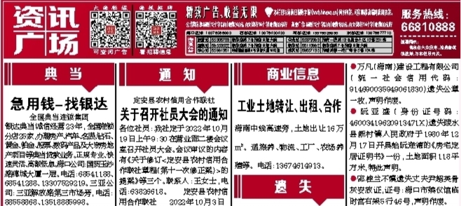 各位社员:我社定于2022年10月19日上午9:30在营业部二楼会议室召开社员大会。会议审议的内容有《关于修订<定安县农村信用合作联社章程(第十一次修正案)>的提案》等三个。联系人:王女士,电话:63826618。